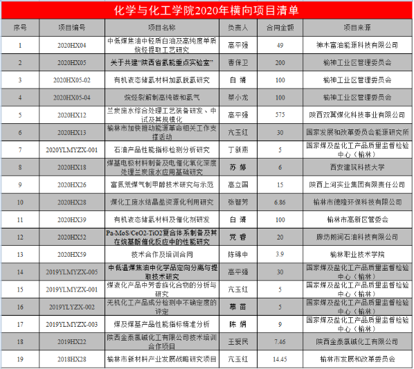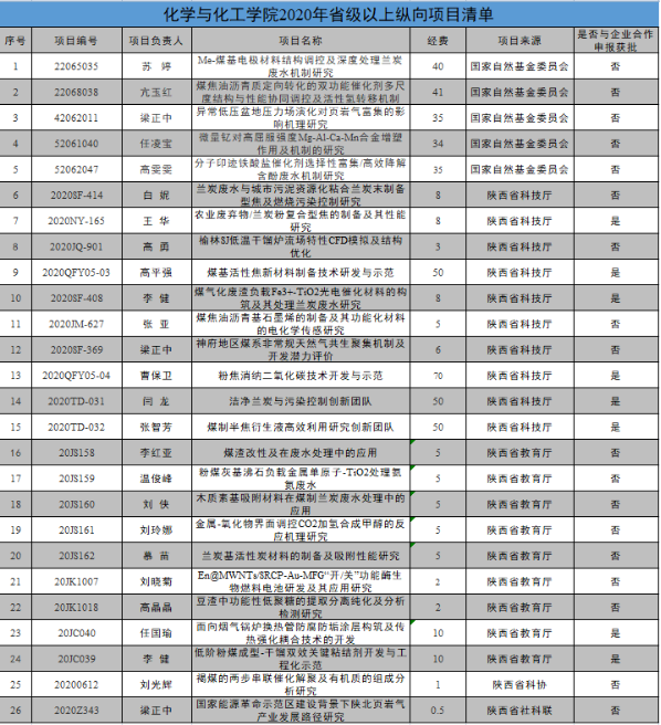 本年度公司共获批各级、各类项目共62项,其中国家自然基金5项、省科技厅项目11项、教育厅项目6项、榆林市科技局项目19项、榆林市高新区项目9项、横向项目13项、企业重大产学研项目2个,合同经费1087万元。与中国科公司洁净能源创新研究院联合开展了重大项目研究,培育国家级科技成果奖,获批经费2400万元。项目立项层次、数量及经费均在公司前列。