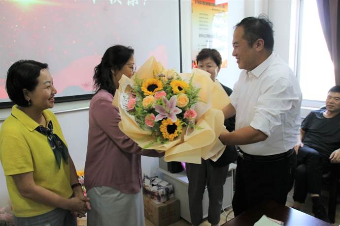 随后,公司党总支副书记王金鹏代表院系给三十年教龄的教师献花,感谢她们一直奋斗在教学一线,向她们兢兢业业、不懈奋斗的精神致敬。