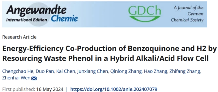 近日,bevictor伟德2021级研究生贺成超同学(导师张智芳教授)以第一作者身份在国际顶级期刊《Angewandte Chemie International Edition》发表了题为“Energy-Efficiency Co-Production of Benzoquinone and H2by Resourcing Waste Phenol in a Hybrid Alkali/Acid Flow Cell”的研究论文,该论文的第一完成单位为伟德bevictor官方网站。《Angewandte Chemie International Edition》为化学领域顶级期刊(影响因子16.6),这是公司研究生首次在该期刊上发表研究论文。